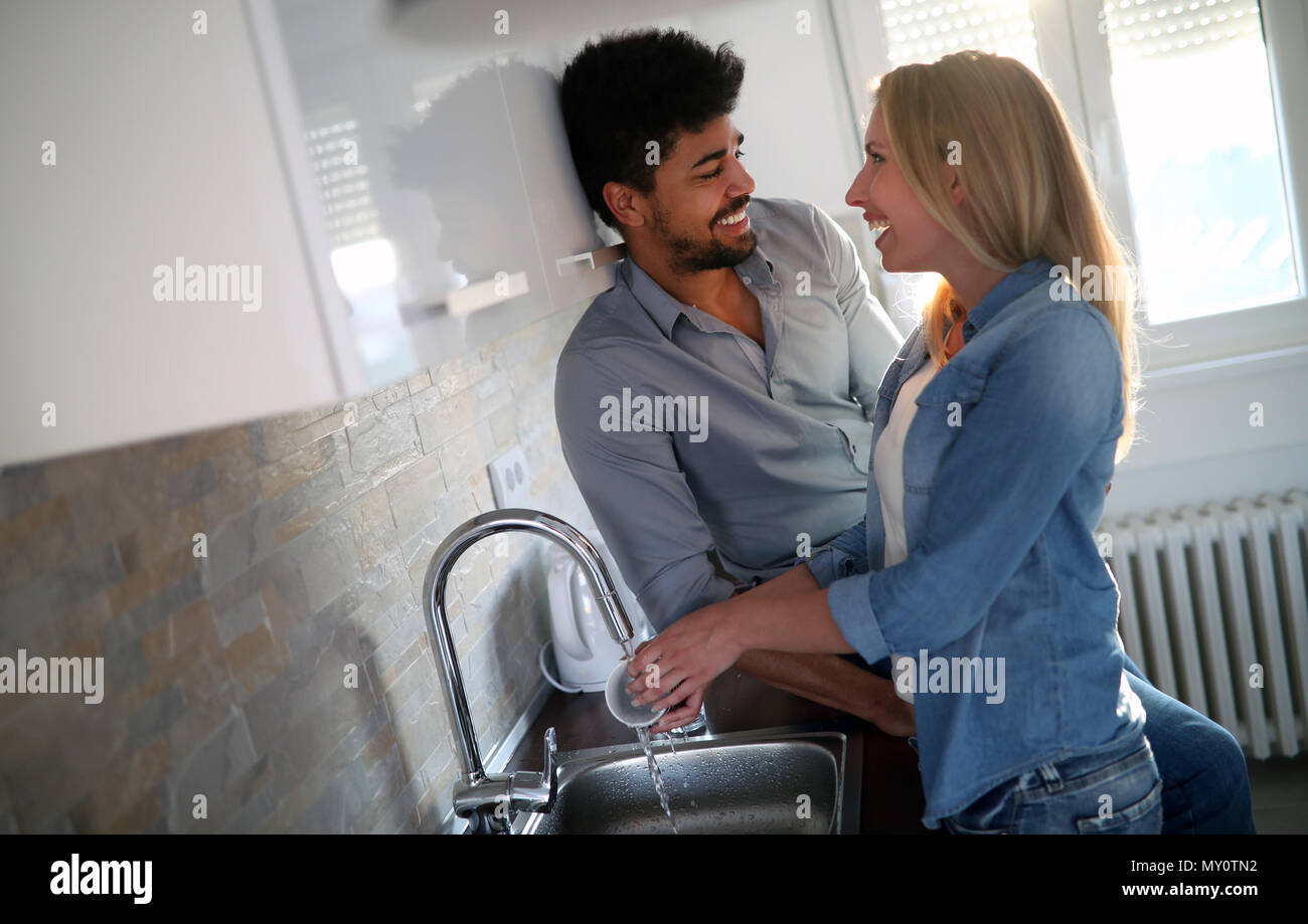 Jeune Couple A Faire La Vaisselle Dans La Cuisine Banque D Images