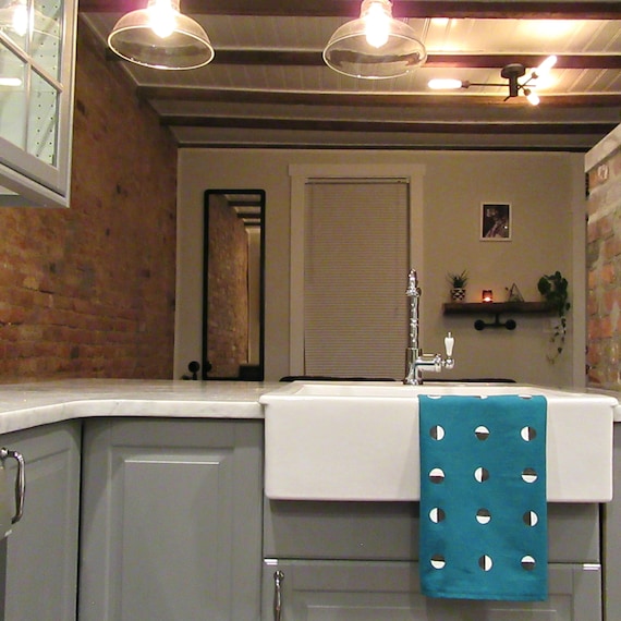 Turquoise Torchon En Lin A Pois Noir Et Blanc Geometriques Formes