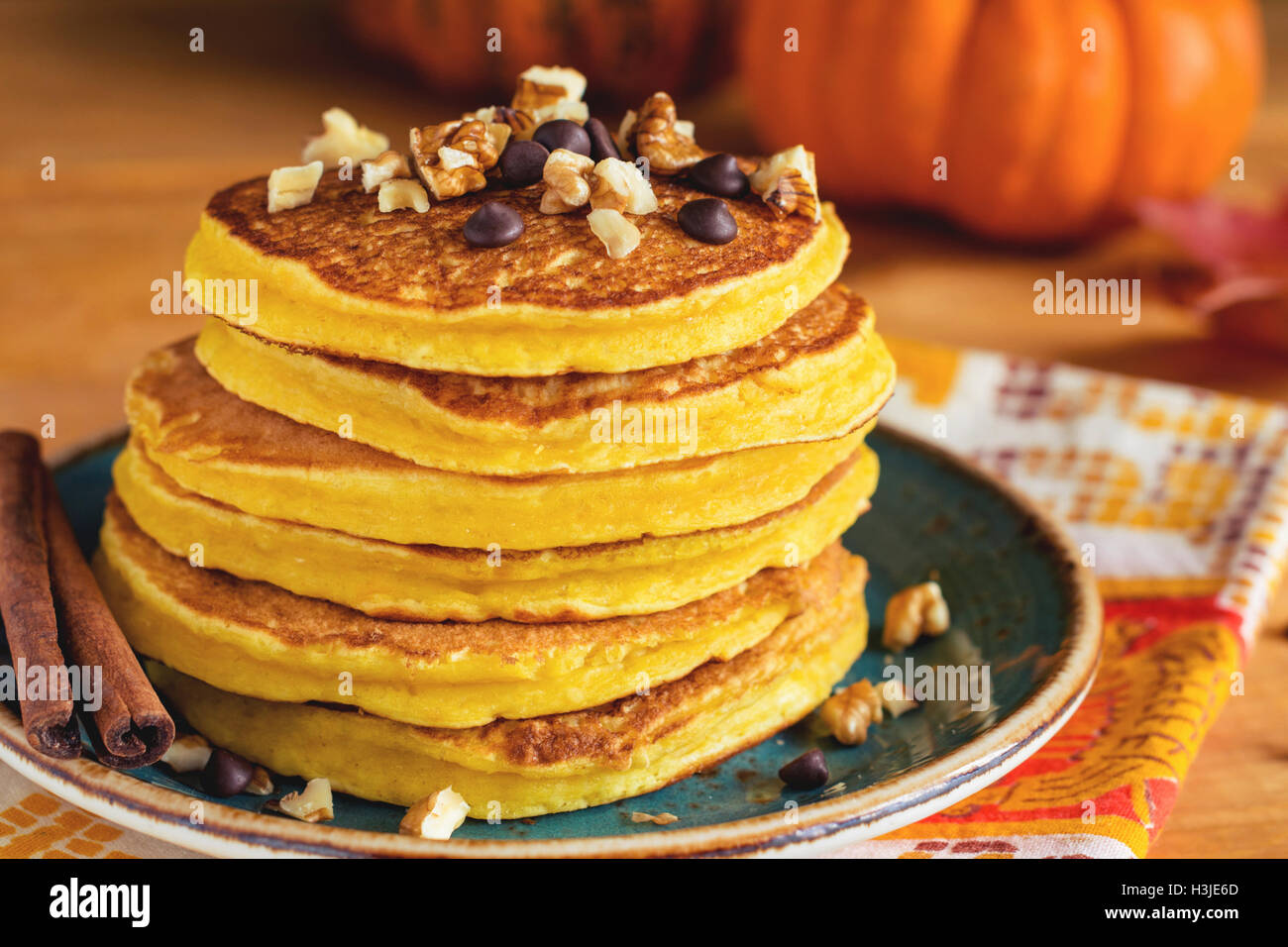 Pumpkin Pancakes With Nuts And Chocolate On Plate Close Up